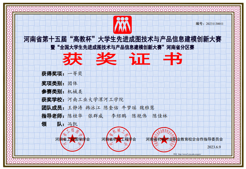 今年河南省省赛参赛人数多达1600余人,59支队伍,其中机械类1001人,参赛人数创历史新高。机电工程系通过校赛多次选拔、集中培训,最终选定王静涛、陈奎佑等11名同学代表公司参赛。在团队老师的悉心指导和同学们的不懈努力下,最终获得成图赛道一等奖3项、二等奖2项、三等奖2项、轻量化设计赛道一等奖的优异成绩。