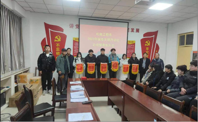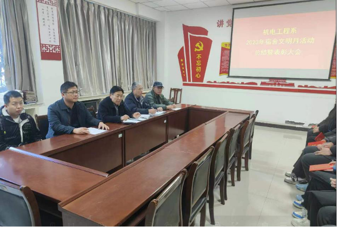 2024年1月5日下午,机电工程系在系会议室召开2023年宿舍文明月活动总结暨表彰大会。系领导班子成员、辅导员及受表彰的先进集体和先进个人参加会议。会议由机电工程系教学负责人谷广超老师主持。