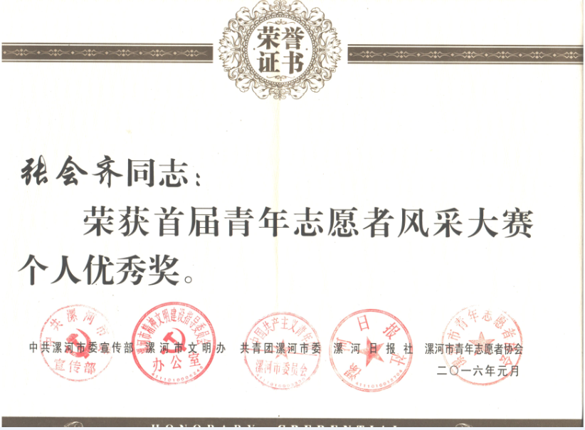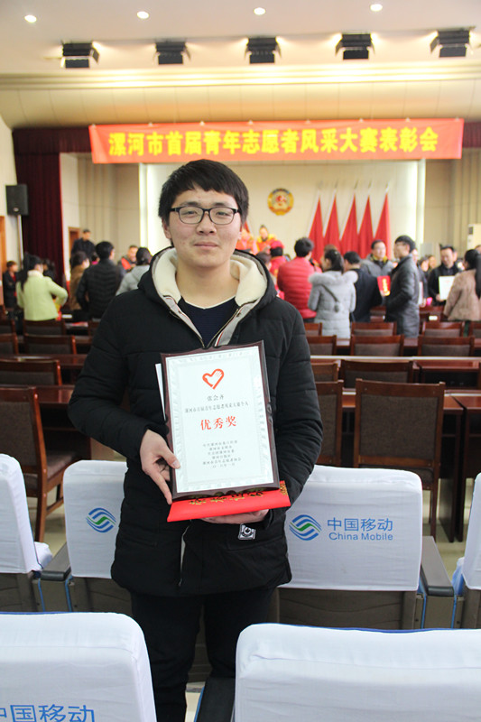 2016年1月20日下午,漯河市首届青年志愿者大赛表彰会议在漯河市政协会议室隆重举行,漯职院机电系张会齐同学获得个人优秀奖。市委常委组织部部长王惠、团市委书记王磊、市文明办副主任孙海武、漯河市委宣传部丁丹、漯河日报社刘新、受表彰的先进团体和个人及社会各界人士100余人参与会议。会议由市文明办孙海武同志主持,会议上市委组织部王惠部长做了重要讲话,她说:青年志愿服务活动是构建和谐社会所必须的一项重要社会活动,优秀的志愿服务项目已经成为漯河双创的一张名牌,薪火传承的志愿者精神会成为社会正能量源泉。主流媒体也应该对志愿服务活动多加关注和报道;广大志愿者应该尽自己的力量,为推动城市和社会的进步而努力。本次受表彰的志愿者一共20人,我系张会齐同学经过前期的申报、微信投票、评委会审议最终进入决赛,获评优秀,是对公司青年志愿服务活动的总体肯定和表彰。